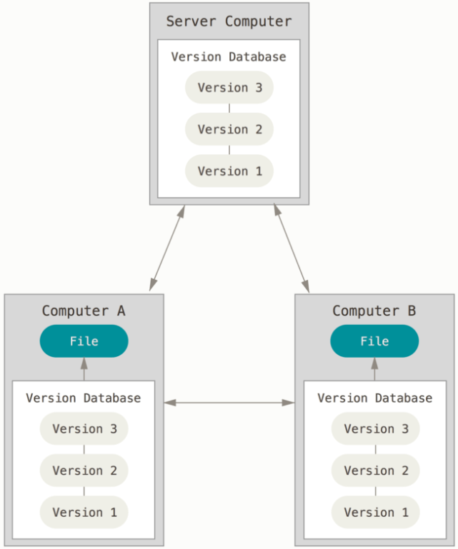 위 단점을 해결한 것이 분산 버전관리 시스템이다. 분산 버전관리 시스템에서는 클라이언트가 서버로부터 파일의 스냅샷이 아닌 데이터 베이스 전체를 복사한다. 따라서 서버에 문제가 생기더라고 클라이언트에 저장된 데이터베이스로 복원할 수 있고 재작업할 수 있다. Git은 분산 버전관리 시스템으로 Clone시 모든 데이터 베이스를 복사하여 사용하게 된다.