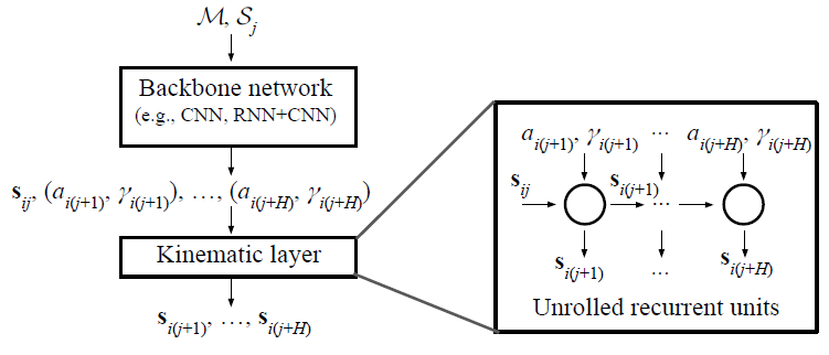 - 백본 뉴럴네트워크에서는 time step 별 주행 객체의 종방향 가속도와 조향각을 예측한다. 이 값을 이용해 Kinematic layer에서는 time step 별 차량의 위치, 헤딩, 속도 등을 계산한다.
